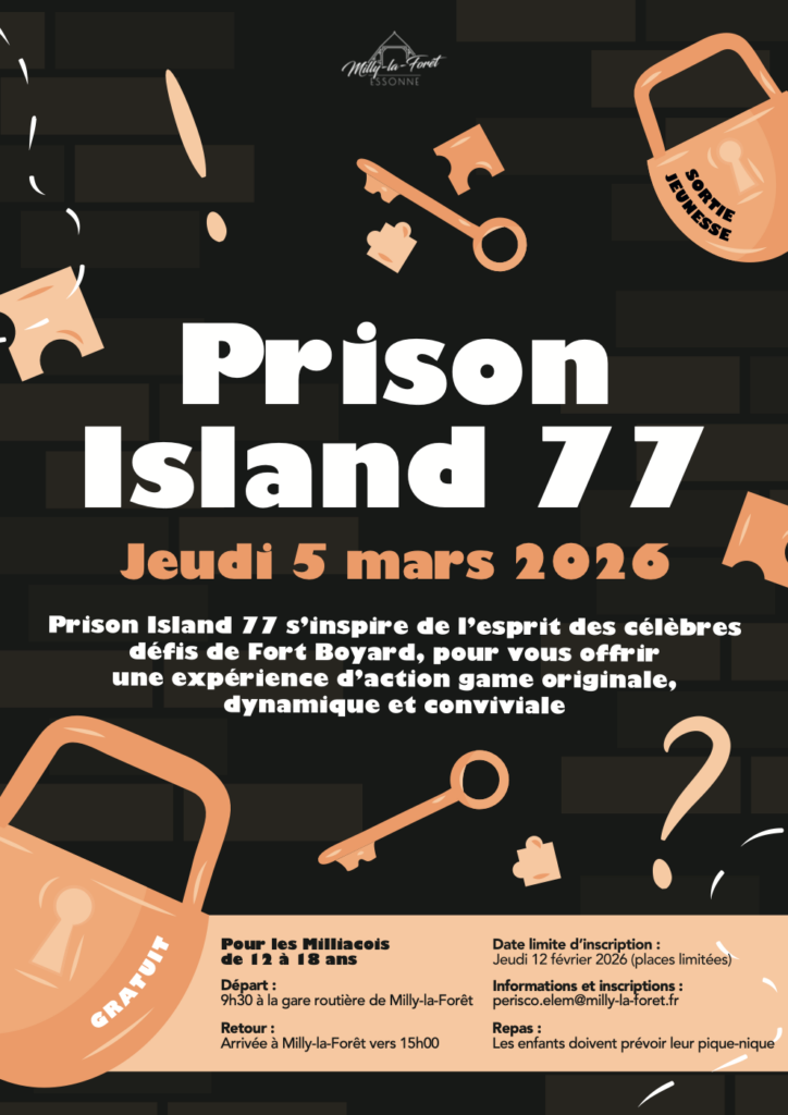 Sortie jeunesse à Prison Island 77 Prison Island 77 : une aventure pleine de défis inspirée de l’esprit de Fort Boyard pour une expérience originale, dynamique et conviviale ! Jeudi 5 mars 2026 Départ : 9h30 – gare routière de Milly-la-Forêt Retour : vers 15h00 à Milly-la-Forêt Repas : prévoir son pique-nique Gratuit Pour les Milliacois de 12 à 18 ans Date limite d’inscription : jeudi 12 février 2026 (places limitées) Informations et inscriptions : perisco.elem@milly-la-foret.fr Une sortie fun et sportive à ne pas manquer pour relever tous les défis !