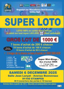 Le club Excellence Sud Essonne Volley Ball organise un loto le samedi 6 décembre à Etampes. L’événement se déroulera dans une ambiance conviviale, ouverte à